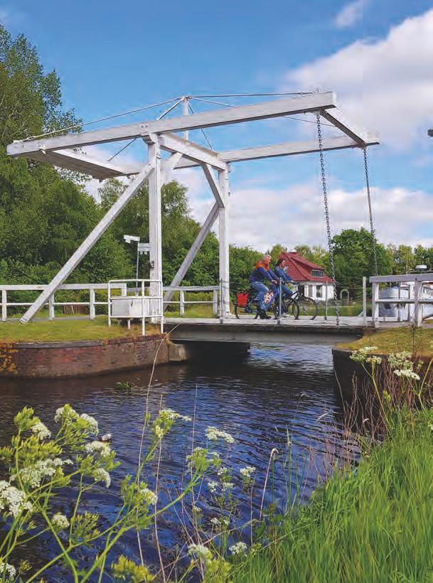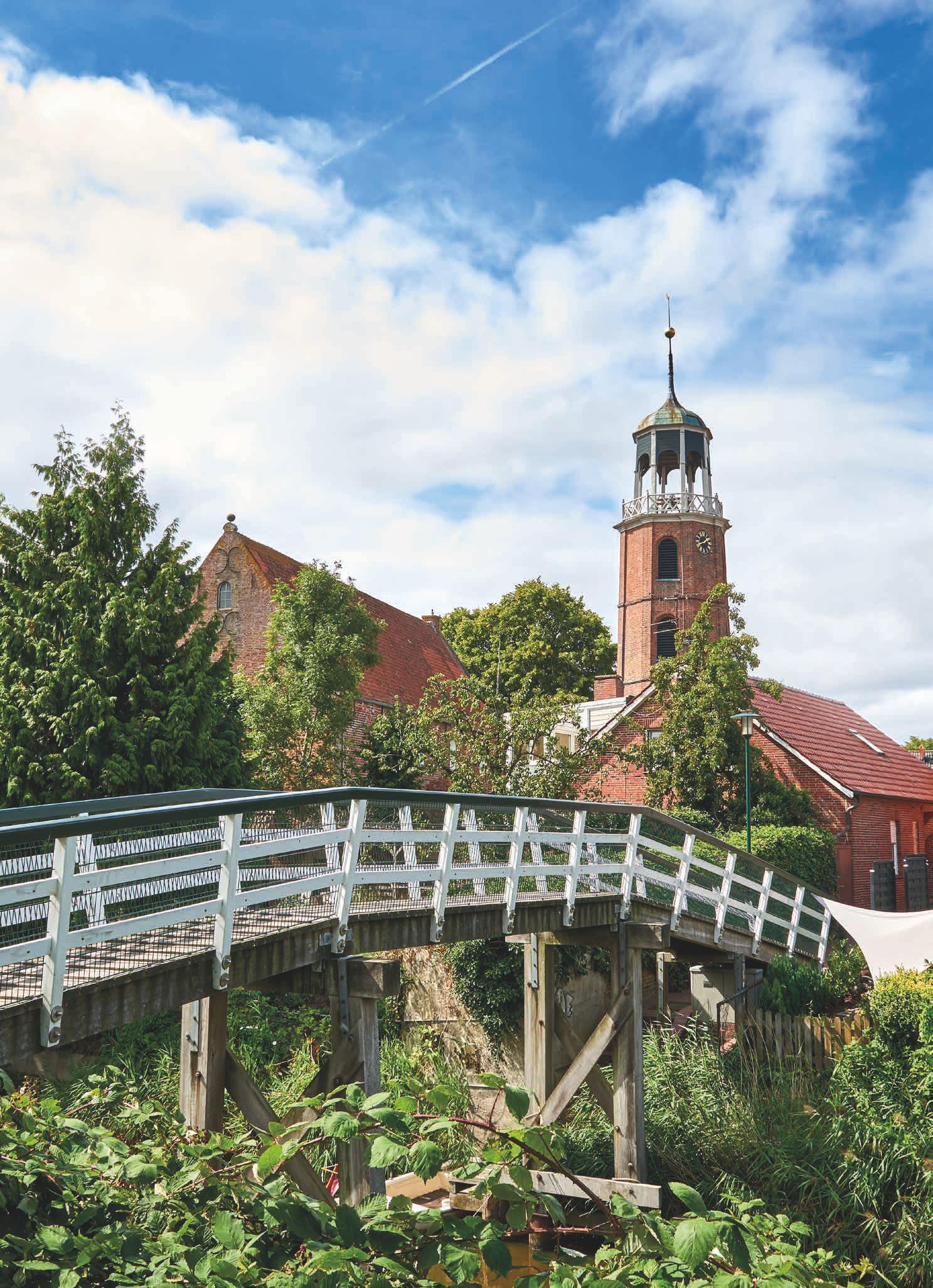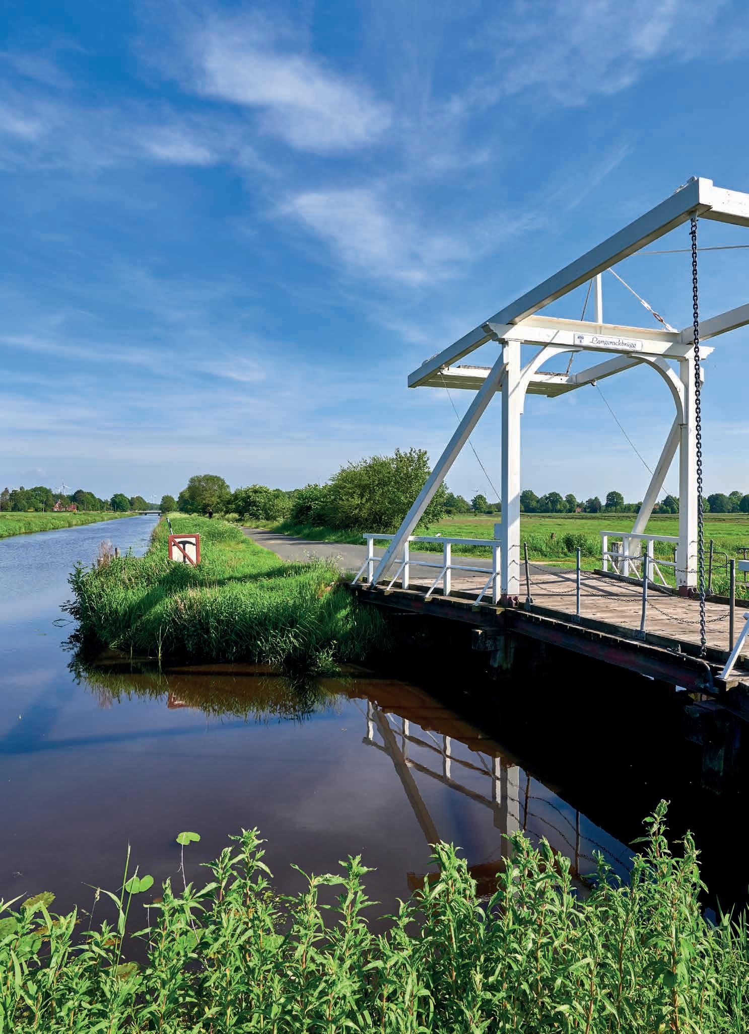 Auf der Deutschen Fehnroute erinnern Fehndörfer noch an jene Zeit, als große Teile Ostfrieslands noch Moor waren. Entlang der Fehnkanäle reihen sich die Dörfer wie an einer Perlenkette mit den typischen weißen Klappbrücken und Mühlen aneinander.
