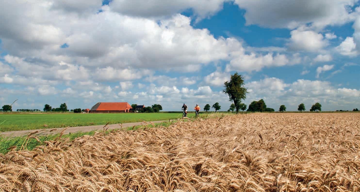 Der frische Wind bringt die salzige, gesunde Luft von der See und mit stetigem Rückenwind rollen die Räder schon fast von allein. Und dann geht es vorbei an grünen Wiesen und Deichen, an schnurgeraden Kanälen, der Nordsee und dem Wattenmeer, kleinen und großen Meeren, windschiefen Bäumen und Parks und Gärten. Und über einem ein schier endlos weiter Himmel mit Wattewolken – durch den mit ganz viel Glück manchmal auch ein Wolkenfahrrad zieht – wie bei uns im Titelbild.