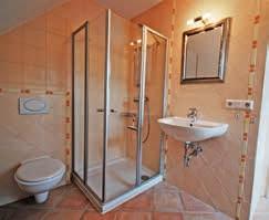 Das Badezimmer im Obergeschoss ist ausgestattet mit einer begehbaren Dusche und WC, Waschtisch mit Allibert, Radio, Waschmaschine und Wäscheständer