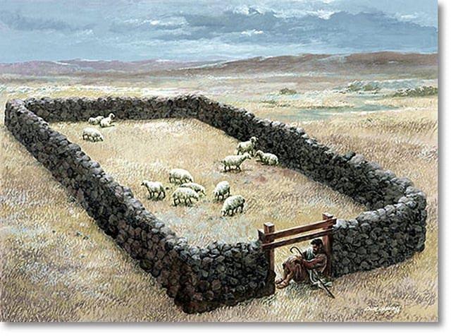 A: Jesus says He is the Gate (v.9) and the Good Shepherd (v.11). In the Judean countryside, sheep pens were a low stone wall about one-metre high enclosing an area. An empty hole functions as a door, and the shepherd sits or lies there acting as a gate to block thieves and protect the sheep. See picture below: