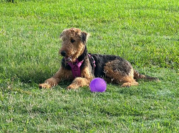 Bailee loves to run, play ball, and spend time with our grandkids nearby. She also loves to borrow your things and make you chase her—it’s her favorite game! We had another Airedale we loved very much until the end of his life. When the time felt right, we got Bailee from the same breeder. She’s a little clown who keeps us laughing and brings so much joy and energy to our lives every day.