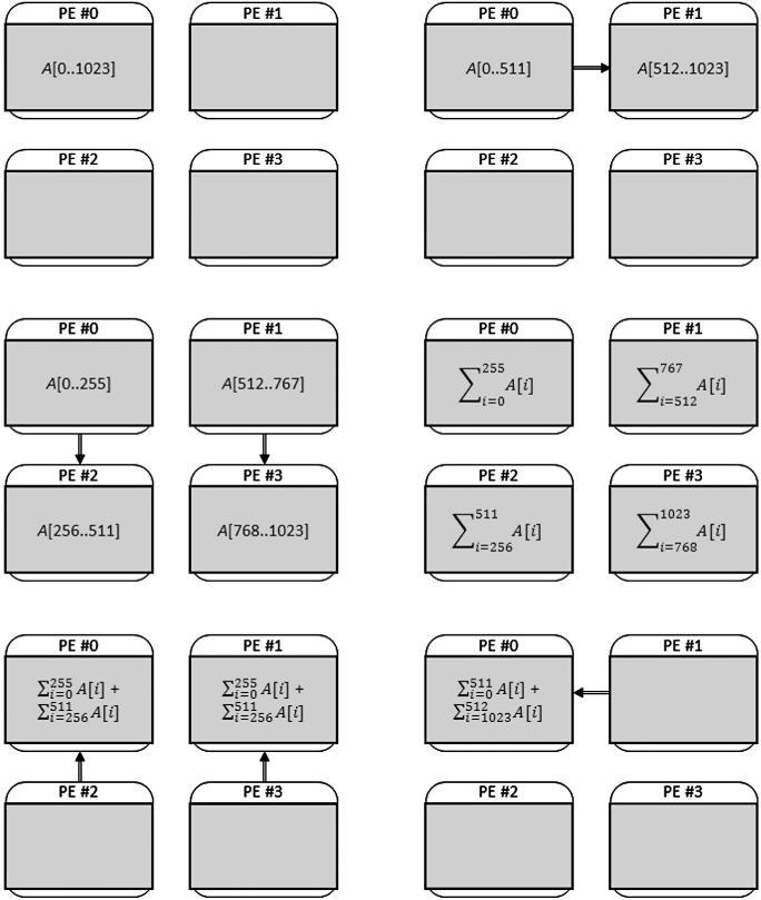 Summationof n = 1024 numberson p = 4 PEs:(A)initiallyPE #0 storesthewholeinputinitslocalmemory; (B)PE #0 sendshalfofitsinputtoPE #1 (takestime 3);(C)PE #0 andPE #1 sendhalfoftheirdatatoPE #2 andPE #3 (takestime 3);(D)EachPEaddsits 256 numbers(takestime 255);(E)PE #2 andPE #3 sendtheir partialsumstoPE #0 andPE #1,respectively(takestime 3).Subsequently,PE #0 andPE #1 addtheir respectivepartialsums(takestime 1);(F)PE #1 sendsitspartialsumtoPE #0 (takestime 3),whichthen finalizesthecomputationbyaddingthem(takestime 1).Thus,thetotalruntimeis T(4, 1024) = 3 + 3 + 511 + 3 + 1 + 3 + 1 = 269