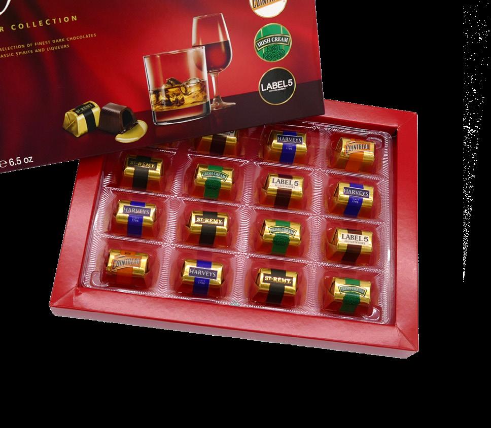 An indulgent selection of the finest dark chocolates filled with classic spirits and liqueurs - including favourites St-Remy, Harvey’s, Cointreau, Irish Cream and Label 5, altogether a great way to have a taster of all these well loved tipples! 185g. Ref. A196875 £15.99