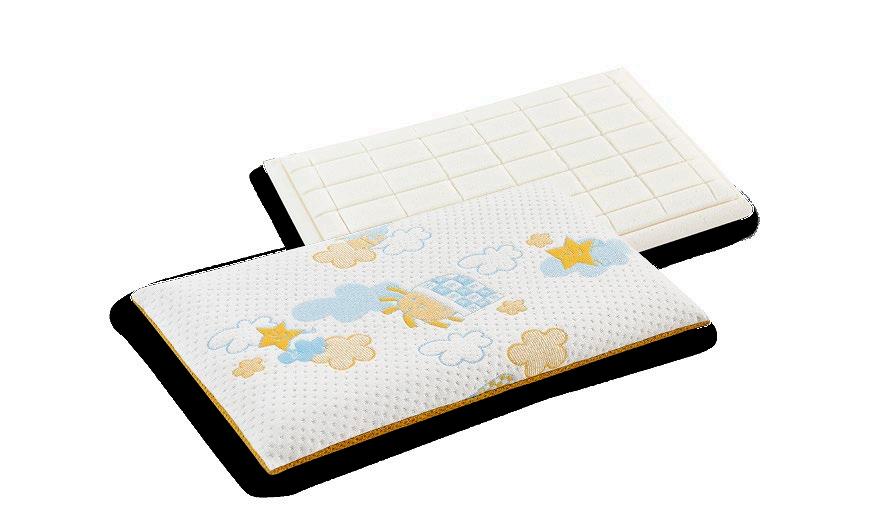 The concept includes mattress and pillow, designed to offer comfort and active support at every stage of growth. Its ergonomic features naturally adapt to the relationship between weight and height, supporting healthy posture and spinal alignment.
