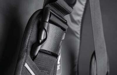 Grande poche étanche sur le côté. Sangles pour mode sac à dos se rangent dans la poche supérieure. Sangle de portage en bandoulière.