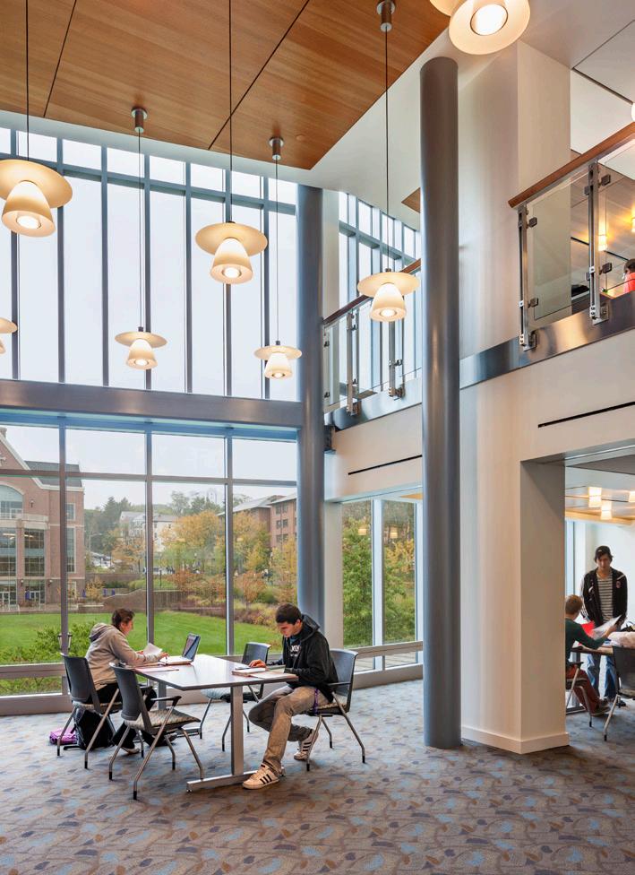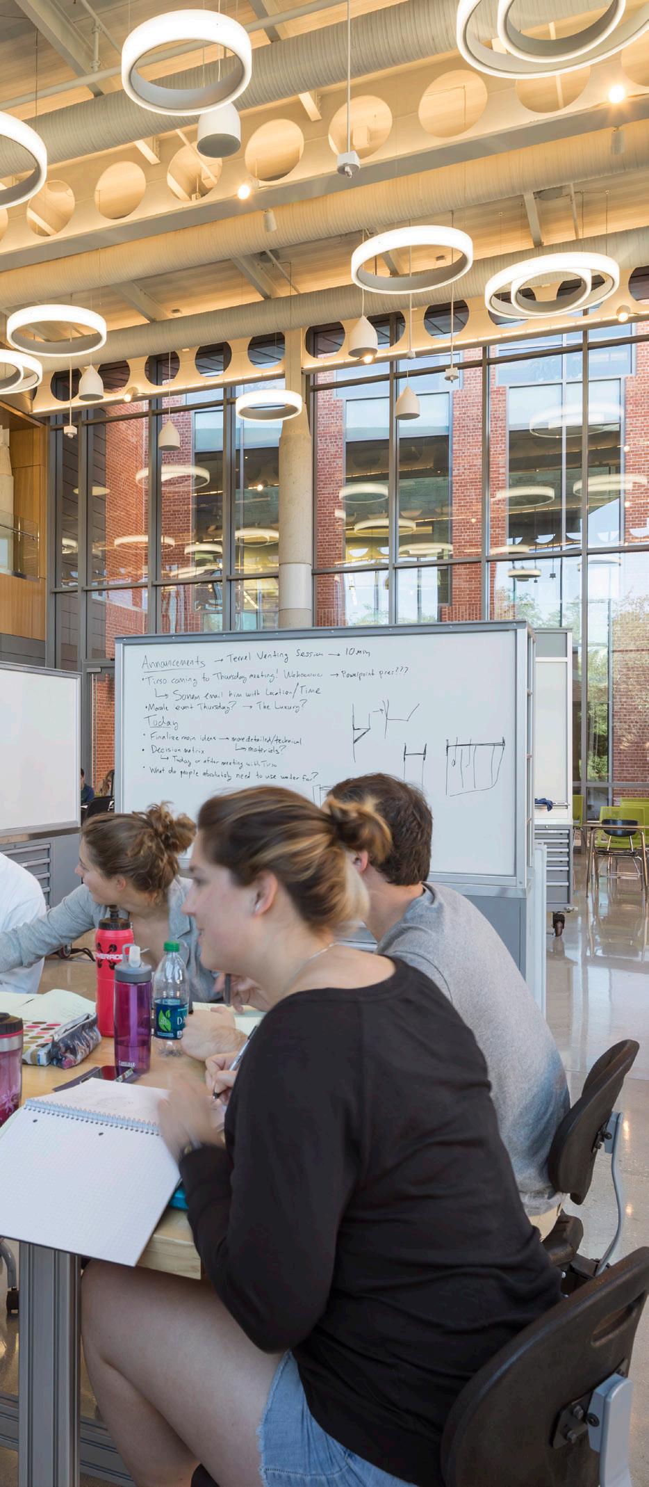 A three-story atrium serves as a campus destination where students, faculty, and visitors collaborate, debate, and innovate. Beyond the building, the project transformed the campus core by removing roads and replacing them with functional, pedestrianfocused gathering spaces.