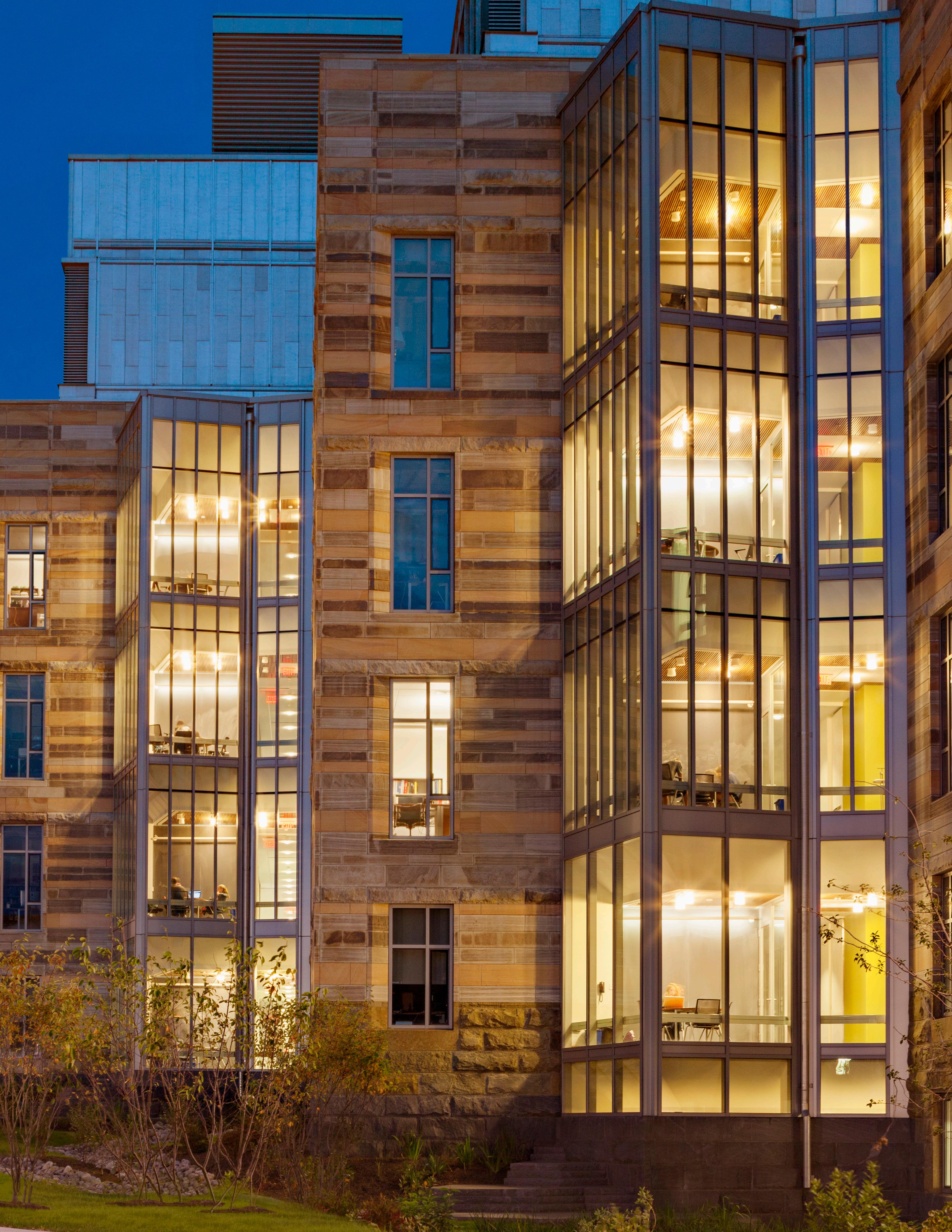 The goal was an open and contemporary design whose materials and massing responded to the surrounding buildings. The design solution combines two familiar materials from the architectural lexicon of the College - limestone and copper - with glass to create a language that draws from the historical palette. Copper panels, with strategically placed louvers, wrap the sophisticated ventilation and heat recovery systems that serve the LEED Gold complex.