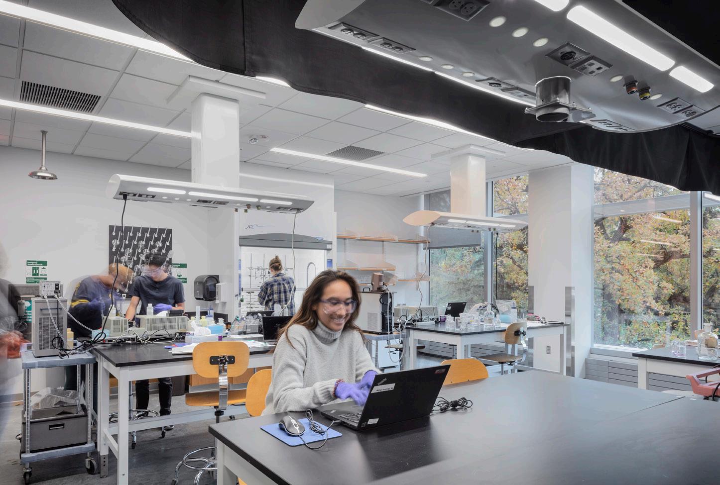 Through selective demolition, an 18,000-square-food addition in the campus’s SpanishMediterranean style created much-needed program space. The remaining 80,000 square feet was modernized, with a reimagined layout designed to spark intellectual connections and reinforce science’s role in a liberal arts education.