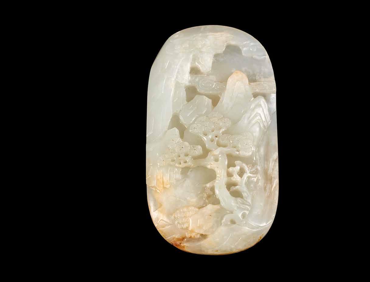 in giada bianca intagliato un paesaggio con un pino su base rocciosa. In lontananza sono rappresentate montagne e nuvole.
