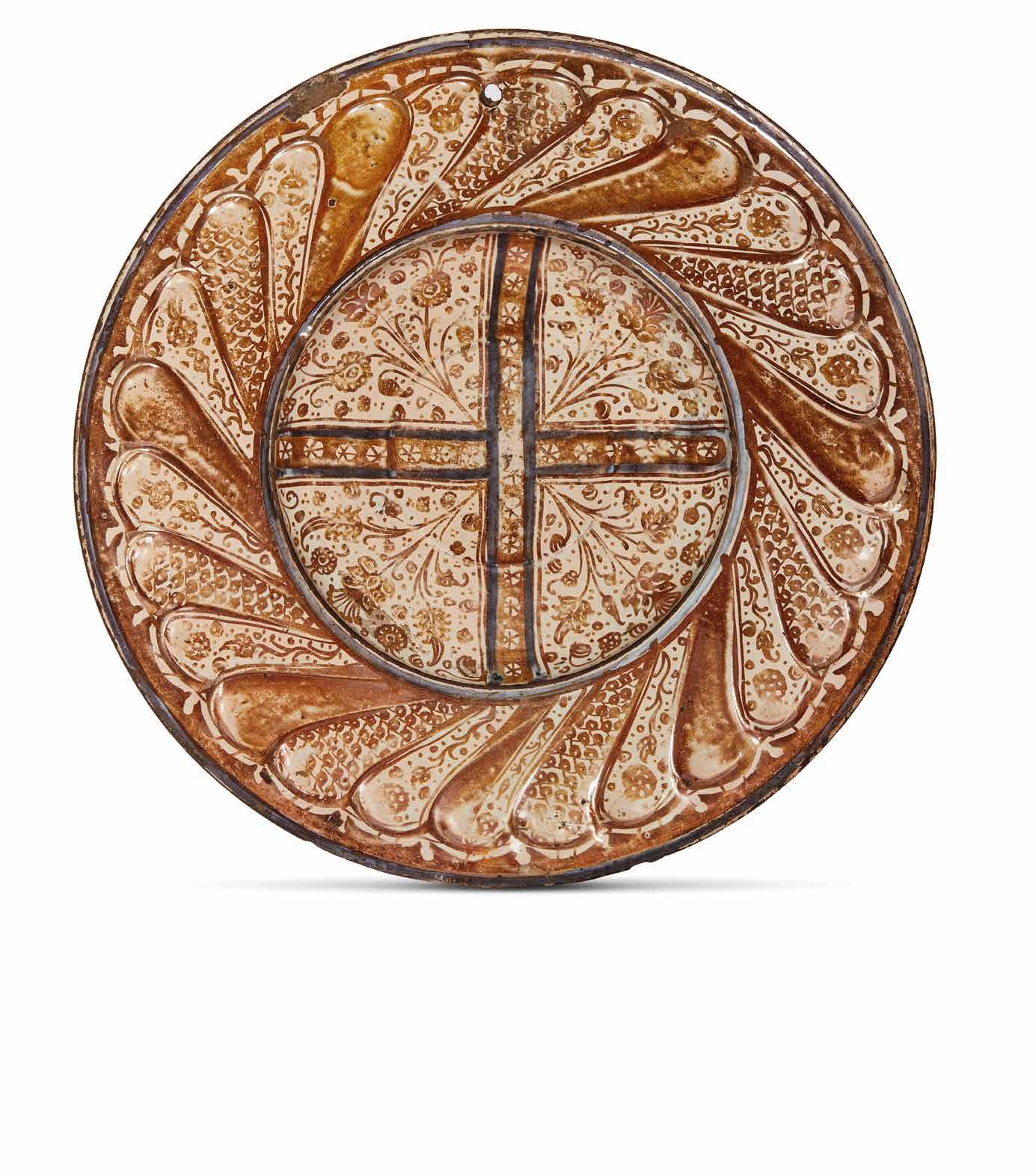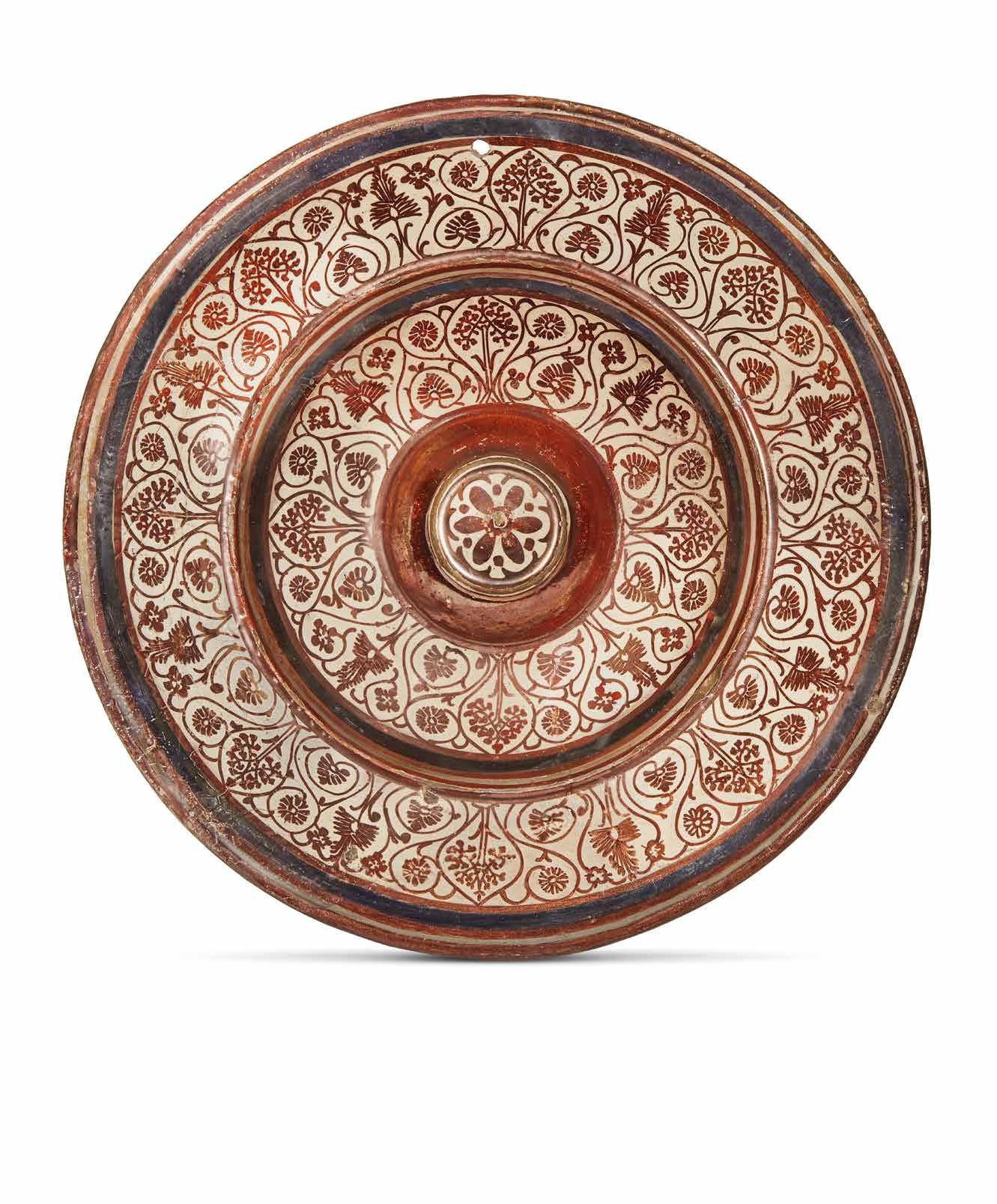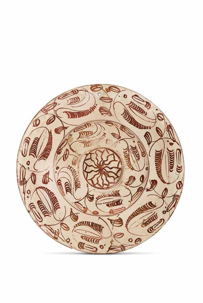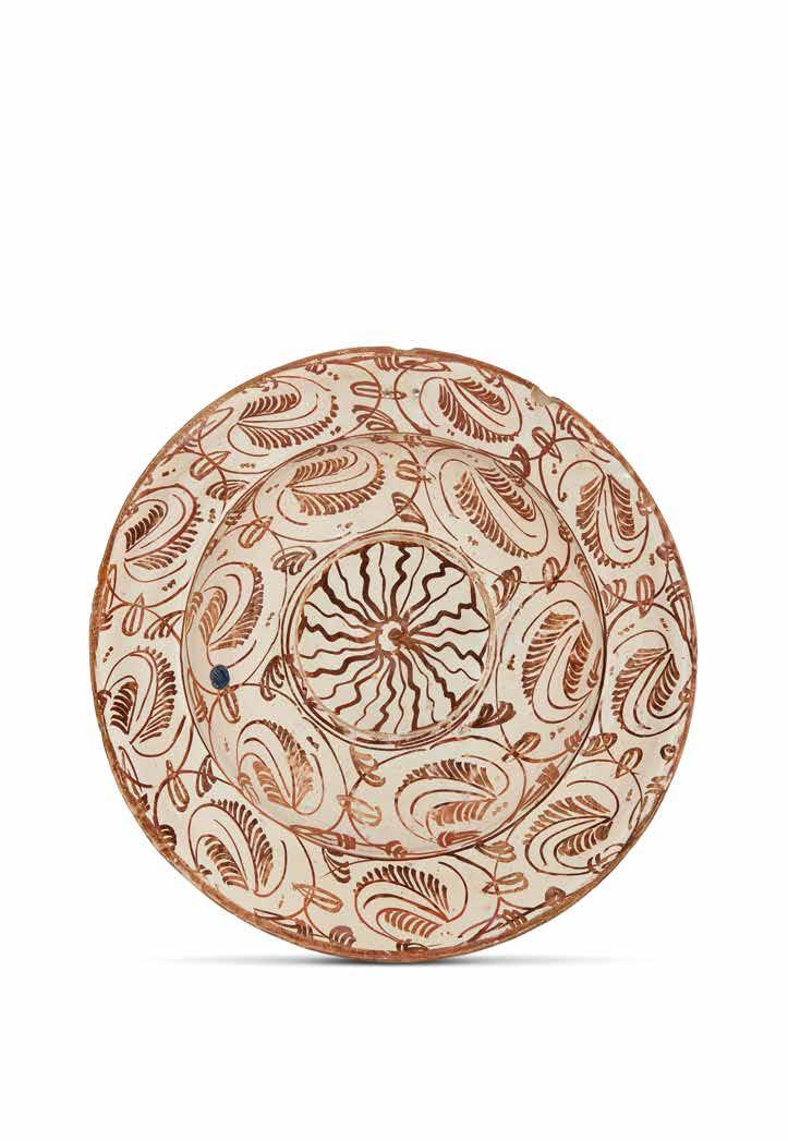 in maiolica decorata a lustro metallico e blu; diam. cm 36,2, alt. cm 6