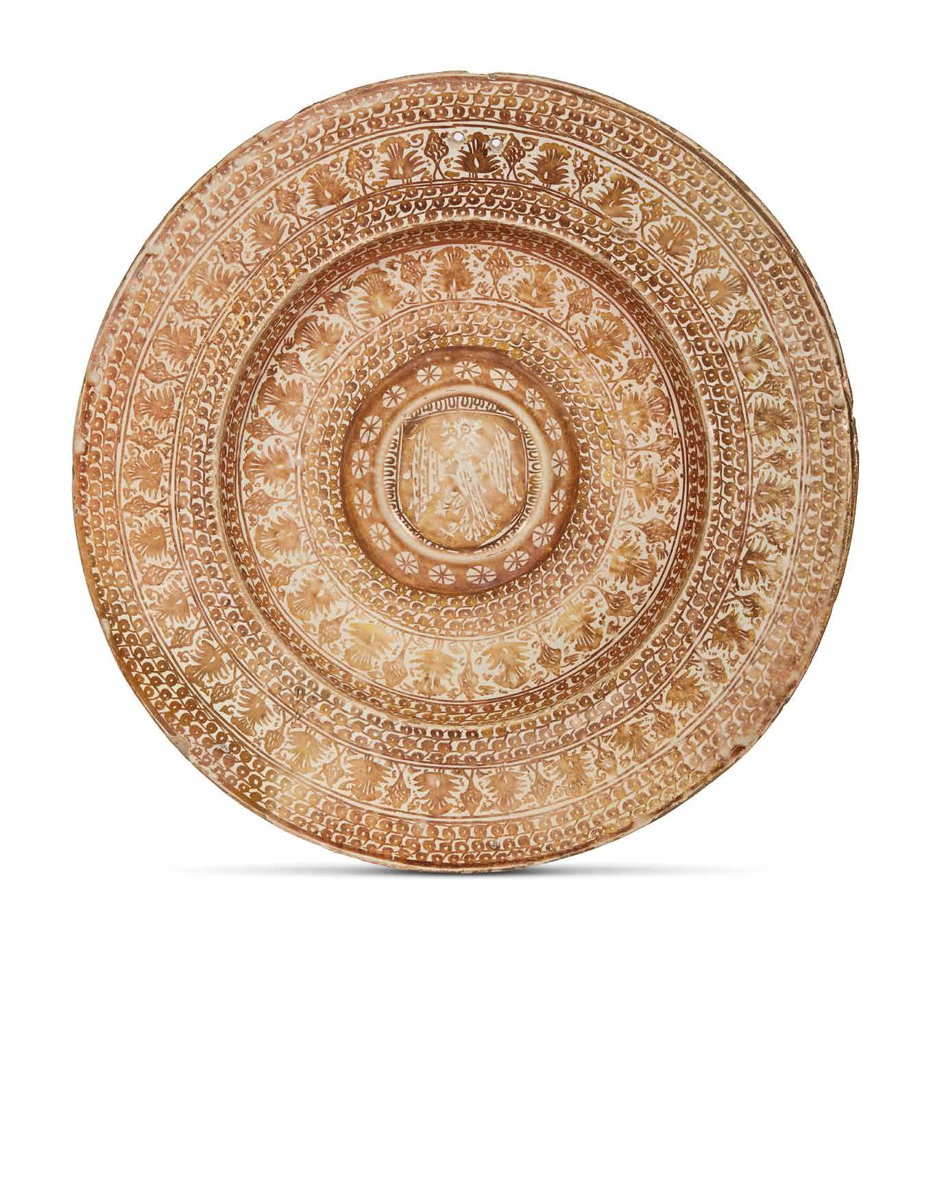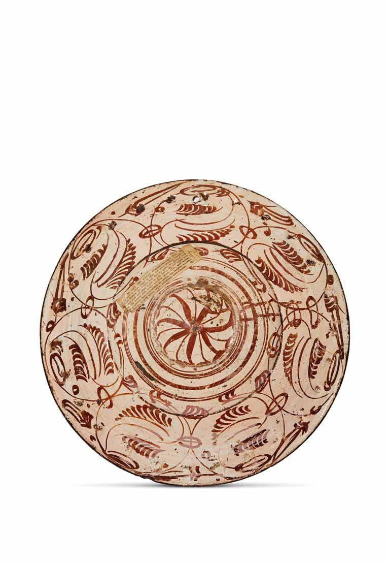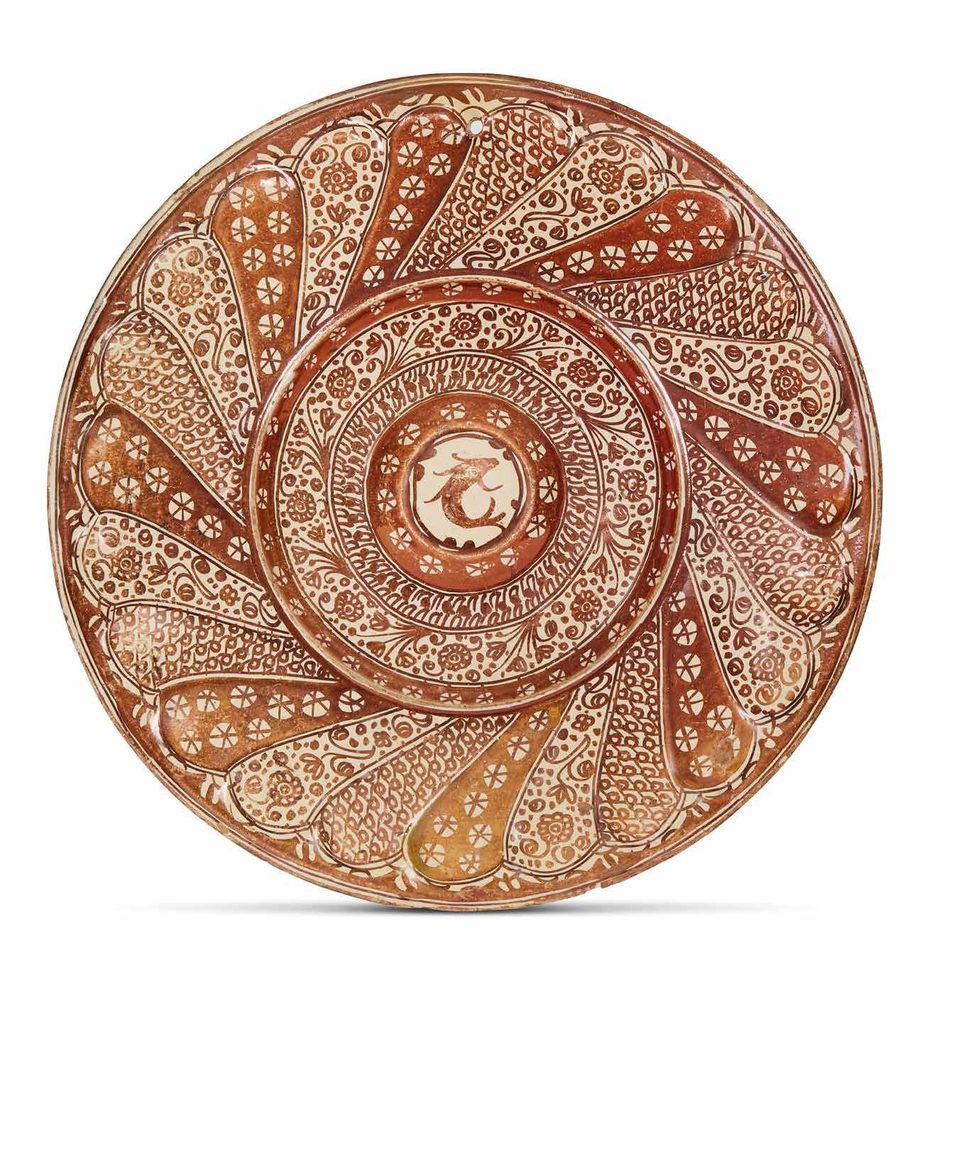 in maiolica decorata a lustro metallico e blu; diam. cm 36,2, alt. cm 6