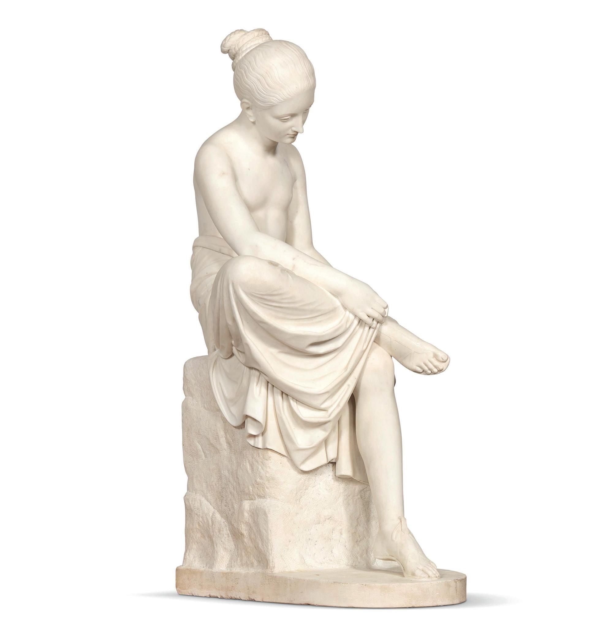 Rudolf Schadow (Roma 1786 - 1822), FANCIULLA CHE SI ALLACCIA I SANDALI, marmo bianco, cm 120x53x63, firmato