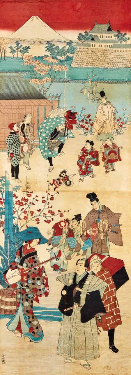 Tipica del genere Ukiyo-e, rappresenta una scena festiva, probabilmente legata a un evento stagionale o religioso. Il Monte Fuji, visibile sullo sfondo, simbolizza l’importanza della natura e delle divinità protettrici nella cultura giapponese.
