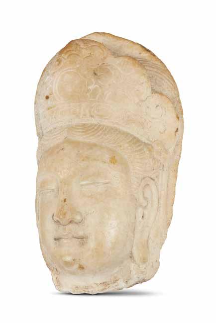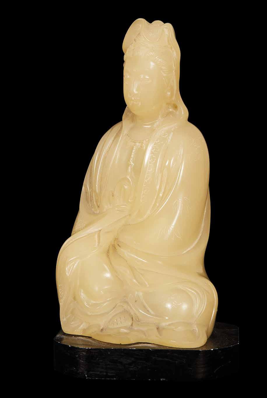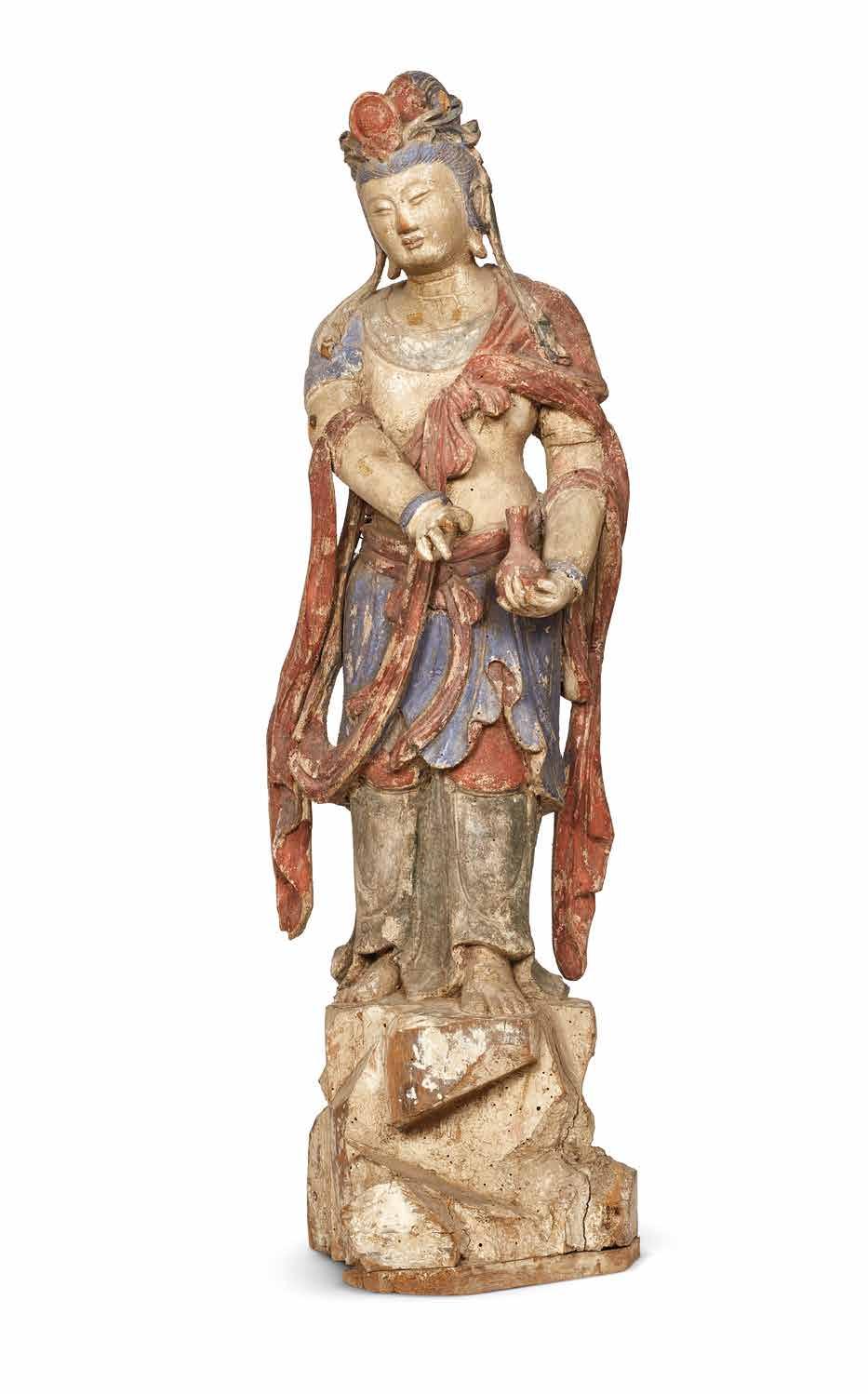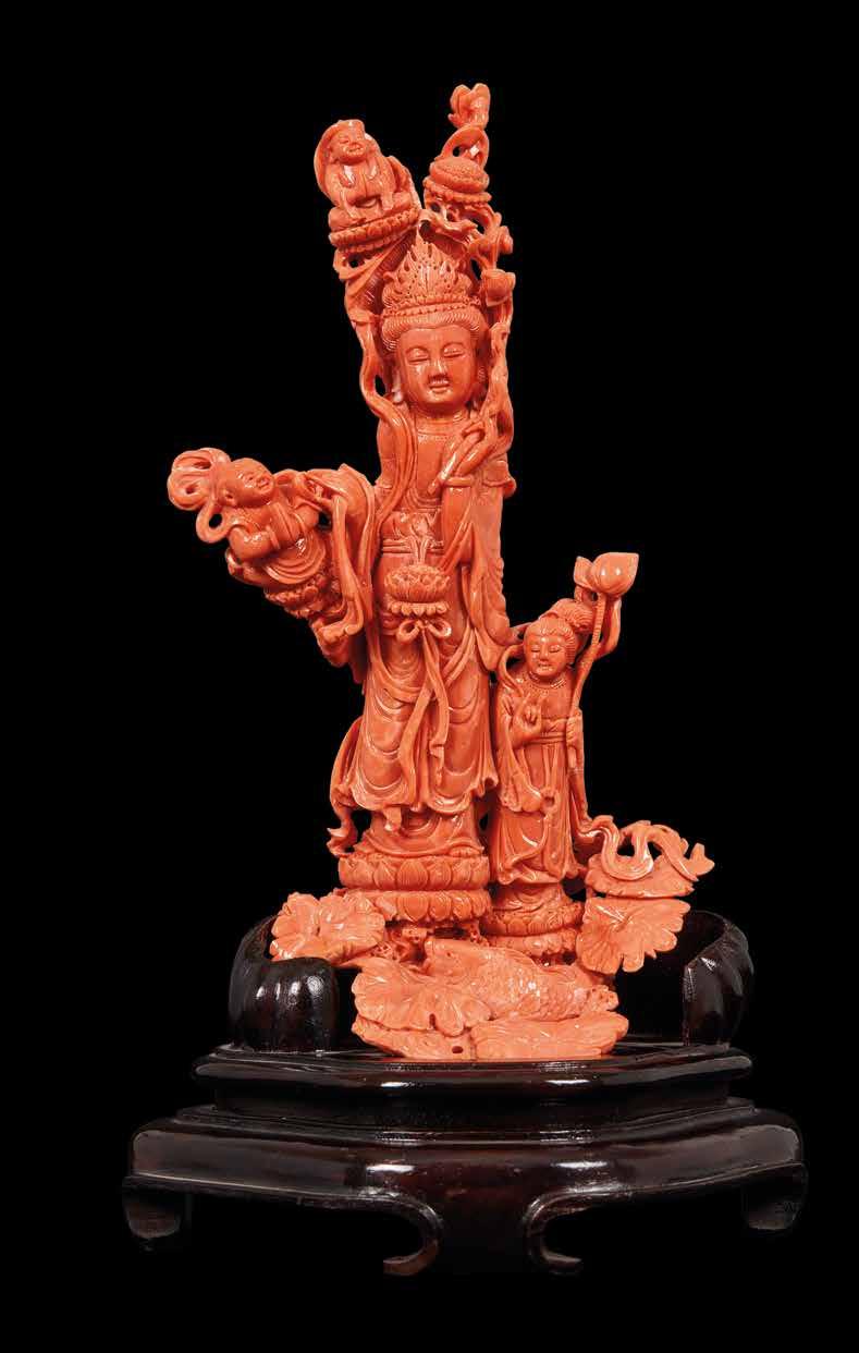 in piedi su una base a loto, simbolo di purezza e illuminazione nella tradizione buddista. La figura è raffigurata in una posizione di calma e serenità, con entrambe le mani sollevate all’altezza del petto, in una mudra che simboleggia protezione e benedizione. Alt. cm 120