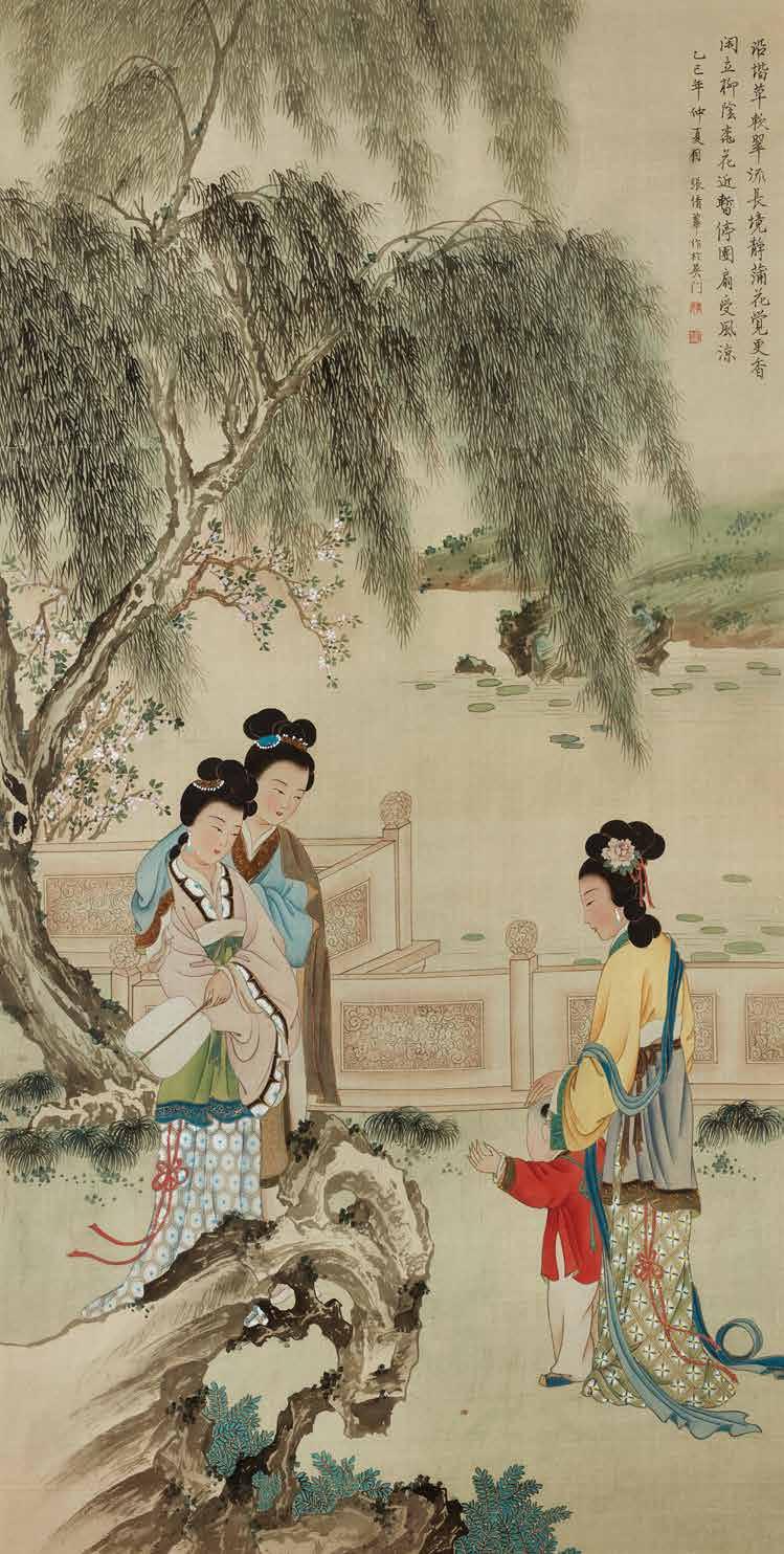 Signed by 张倩华 (Zhang Qianhua, 1930–2012), on silk, depicting a scene of daily life in a Chinese garden, with three women and a child under a willow tree, immersed in a serene landscape. Zhang, a disciple of Shen Zicheng, combines traditional techniques with a delicate style, evoking elegance and harmony.