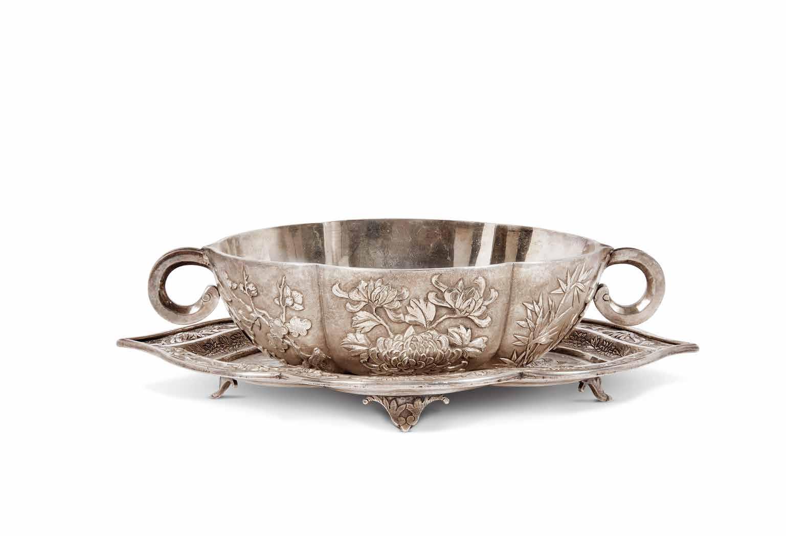 Elegante coppa in argento cinese, accompagnata da un piattino, risalente al XIX secolo. La coppa presenta due manici a forma di anello e un corpo finemente inciso con motivi floreali, tra cui fiori di crisantemo e rami di bambù, simboli di longevità e resilienza nella cultura cinese.