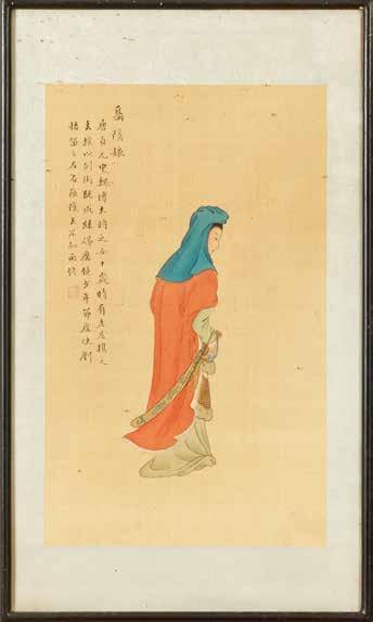 Su seta raffigurante cinque donne armate famose, ognuna di essa è accompagnata da una breve descrizione delle medesime, reca il marchio Zhou Qi (周绮).