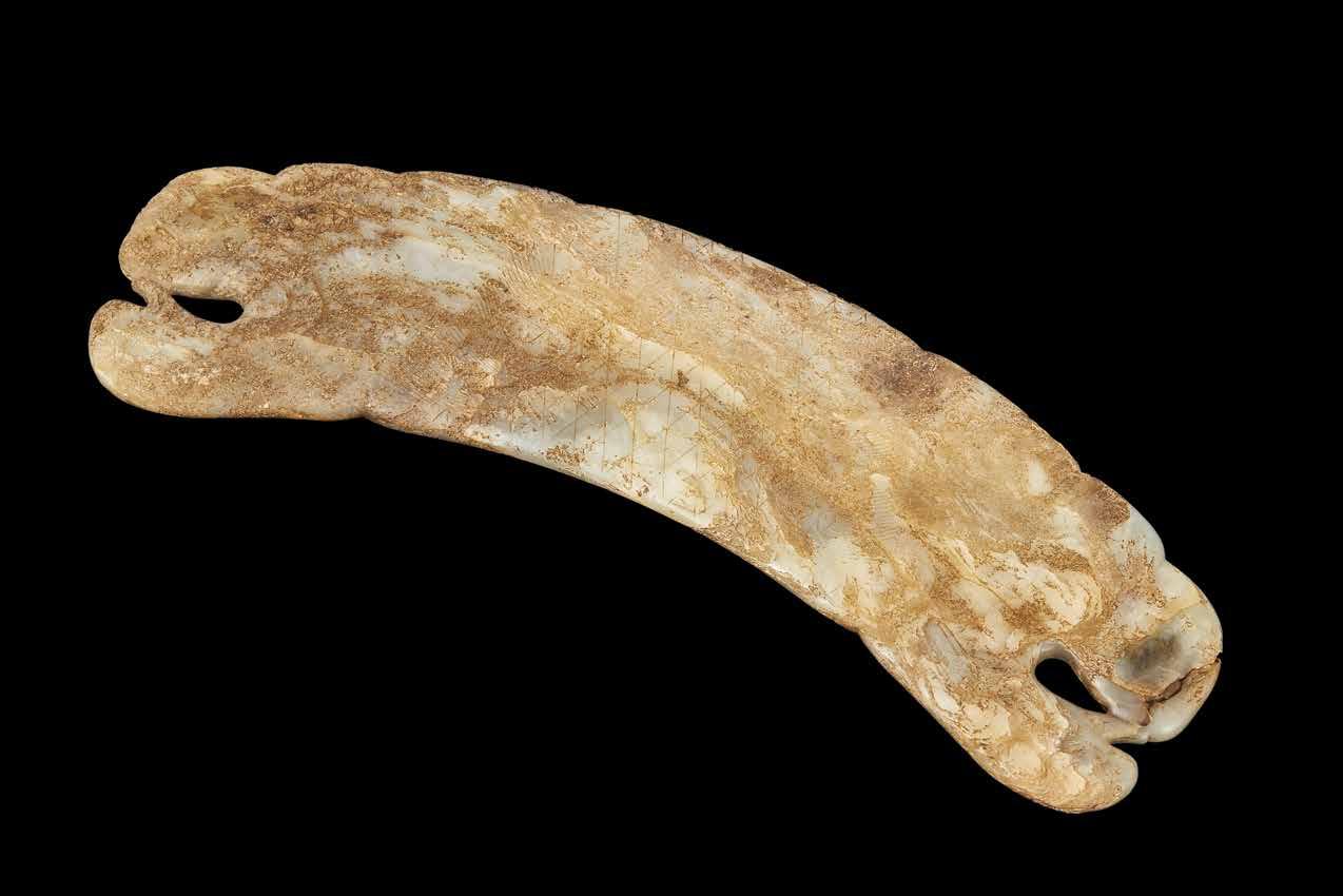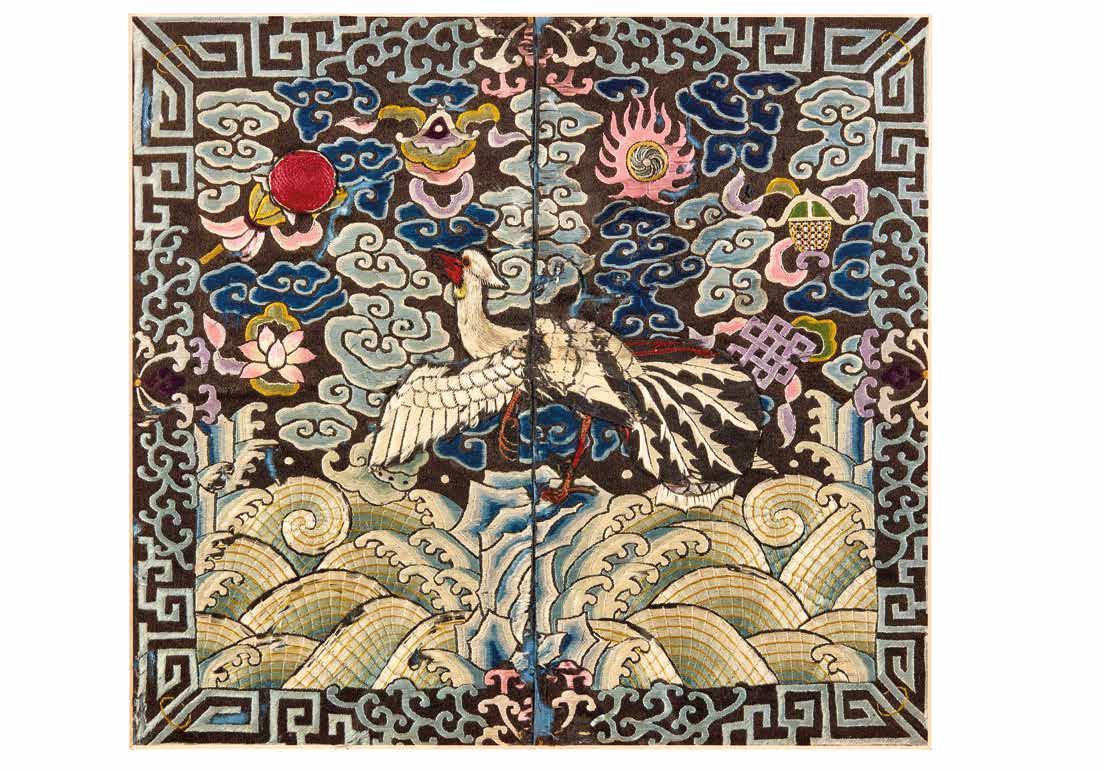 Riquadro di tessuto ricamato, noto come Buzi, tipico dei gradi ufficiali nella dinastia Qing. Il ricamo raffigura un airone in volo, circondato da onde stilizzate, nuvole e simboli di buon auspicio come fiori di loto e nodi senza fine.
