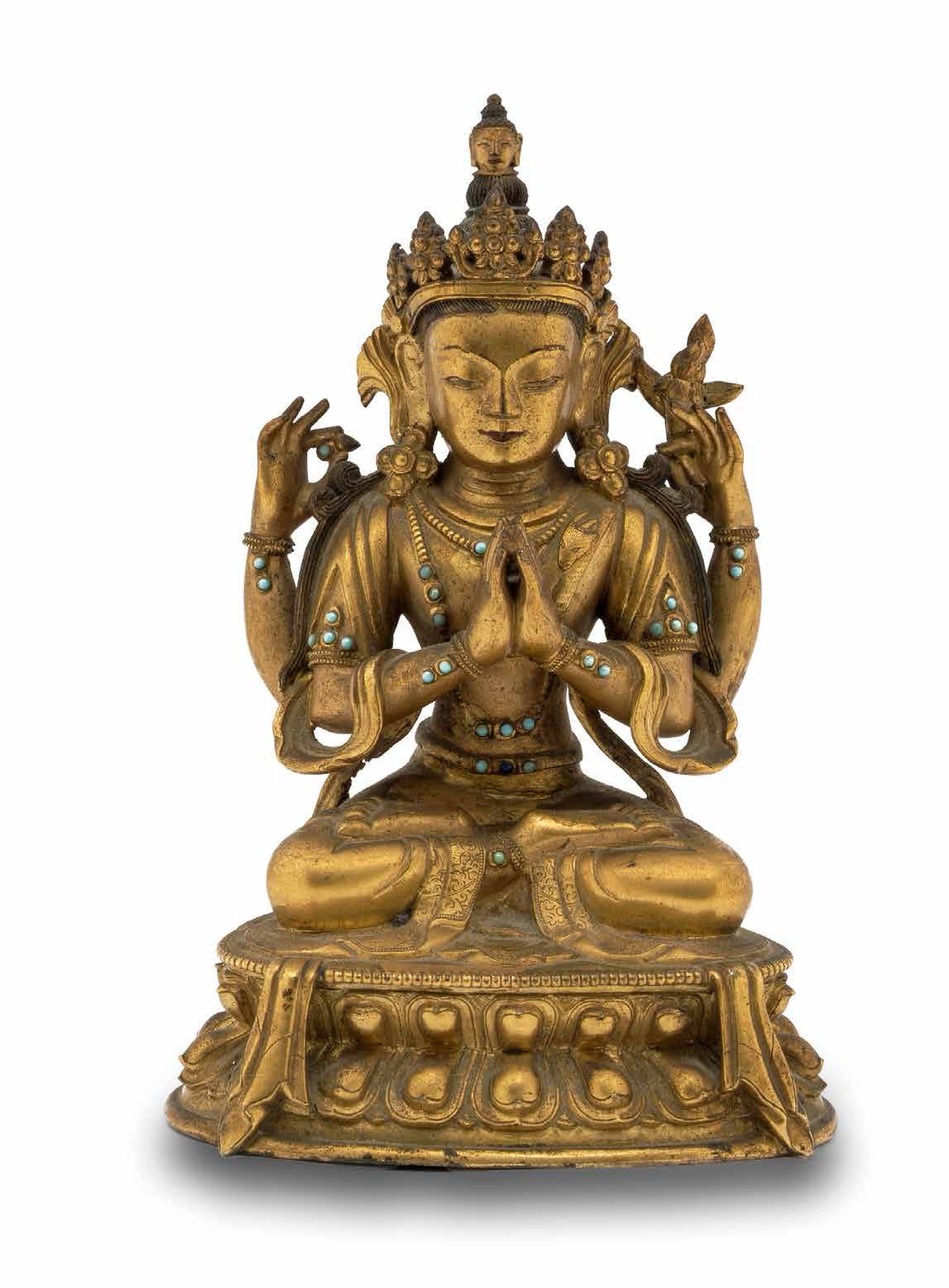 In argento, raffiguranti diverse manifestazioni del Bodhisattva Avalokiteshvara, una figura sacra nel buddismo tibetano simbolo di compassione e benevolenza. Ogni statuetta è finemente cesellata e rappresenta Avalokiteshvara in differenti mudra e con attributi iconici, come il loto e il rosario, su basi a forma di loto, che simboleggiano purezza e risveglio spirituale.