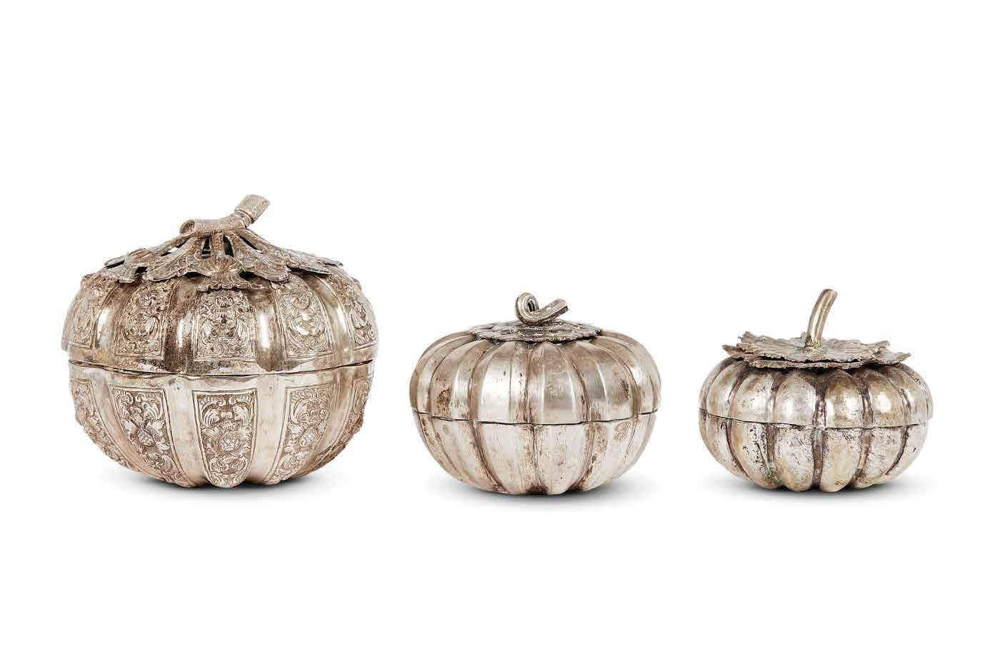 A SET OF SILVER BOXES IN THE SHAPE OF PUMPKINS, CHINA, 19TH CENTURY in chiseled silver, crafted in the shape of pumpkins, with lids decorated in relief, featuring leaves and tendrils. Each box has a ribbed design, typical of pumpkins, with engraved details that highlight the craftsmanship of the period.