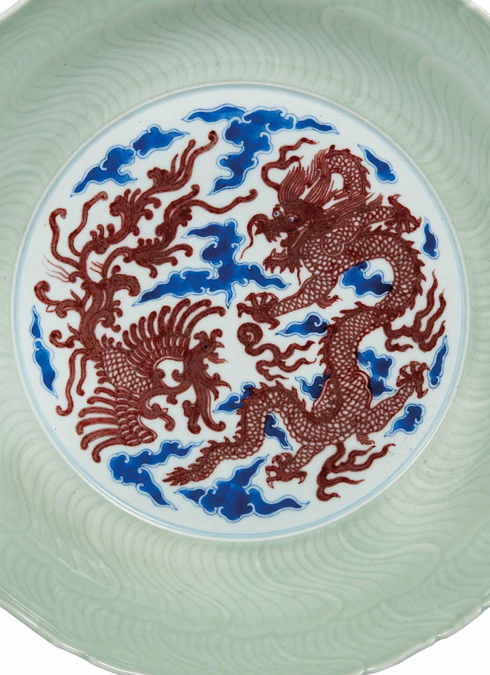 su seta raffigurante fenice sopra il mare immerso nelle nuvole, bordo decorato con nuvole a forma di ruyi.