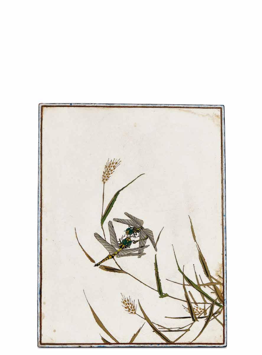 Hand-painted enamel panel depicting a natural scene with a dragonfly flying over grasses and marsh plants. The soft colors of the background gently contrast with the details of the central subject.
