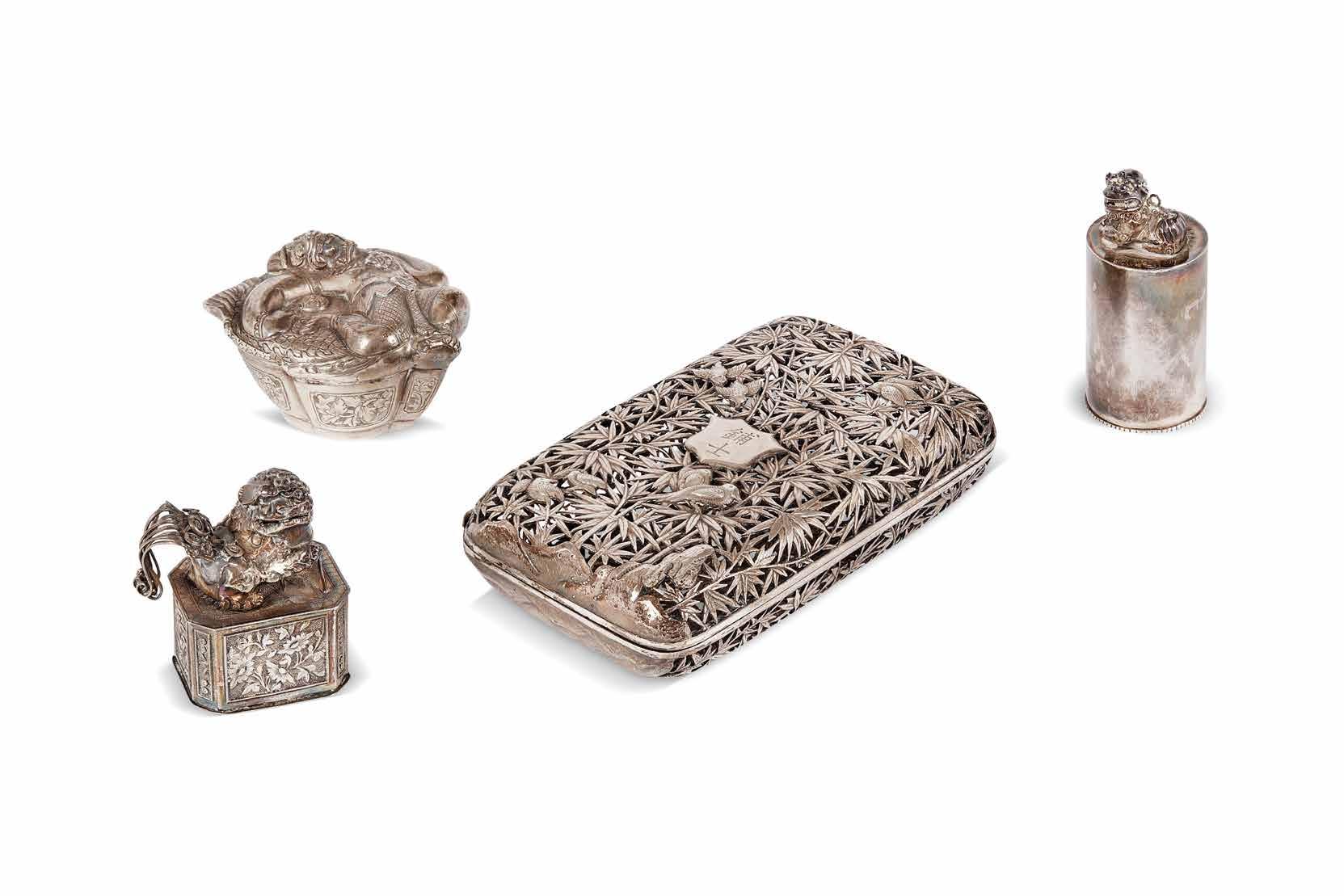 清十九世纪 银制器物一组四件,包括一件竹纹镂空盒、一件带盖小杯、一件带圆柱形容器和一件带狮子图案的方形盒子