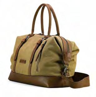 Explorer Mini: borsa da viaggio fatta con tessuto di cotone a trama serrata prodotto in Etiopia di colore khaki tinto con pigmenti estratti dalla terra e rifiniture in pelle di zebù, cm 59x37x19