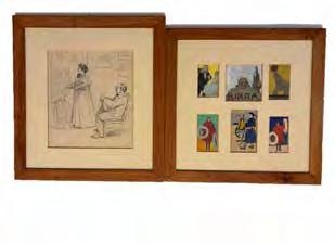 Sei maquette pubblicitarie per birra, copertoni per auto e altri prodotti, tempera su cartoncino, cm 37x39, primo quarto del sec. XX, montante in un’unica cornice in legno e artista nello studio al cavalletto, con astante seduto a osservare, carboncino su carta, sec. XIX/XX, cm 30x26, entro cornice in legno