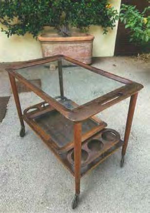Tavolino a carrello rettangolare in legno con piano a vetro e sottopiano con vassoio estraibile e 6 portabottiglie, piedi a rotelle, cm 62x84x50, anni ‘50/’60