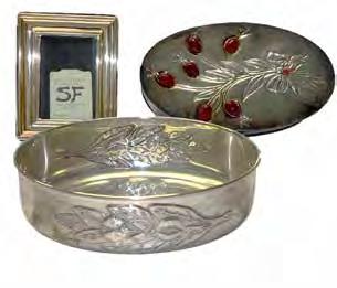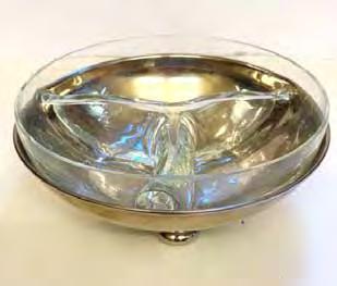 Gabriella Crespi: coppa circolare in metallo argentato a fascia liscia su 3 piedi a cipolla completa di vasca a tre scomparti in vetro, firmata, anni ‘70/’80