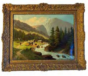 Artista della seconda metà del sec. XIX/ inizio sec. XX raffigurante paesaggio fluviale con ponte a tre arcate, olio su tela, cm 45x36, entro cornice in legno dipinto e dorato