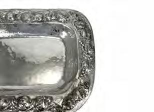Grande centrotavola in argento rettangolare con angoli arrotondati, bordo a fascia sbalzato con melograni ed altri frutti autunnali, gr 1970, cm 4x47x35