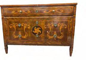 Cassettone a 3 cassetti in stile maggiolino del sec. XVIII, interamente impiallacciato e intarsiato con motivi vegetali e medaglioni contenenti panoplie e rosoni, gambe a obelisco rovesciato, sec. XX, h cm 86x124x54, lievi mancanze