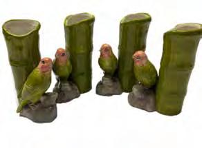 Scatolina rettangolare in vimini decorata da nappe e foderata di stoffa rossa capitonné, fine sec. XIX, lungh. cm 35 e 2 coppie di reggilibri di cui una in forma di 2 pappagalli in metallo su base rettangolare in marmo nero, h cm 14,5 e l’altra in terraglia policroma raffiguranti cavalli che saltano l’ostacolo, h cm 16