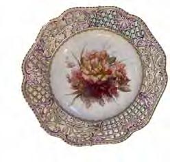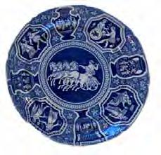 Grande piatto in porcellana di Berlino, dipinto al centro con fiori policromi, tesa sagomata e traforata con motivi vegetali e rocaille e lumeggiati in oro, rosa e verde, seconda metà sec. XIX, Ø cm 26,5 e piatto in terraglia inglese decorata in vari toni del blu, con figure classiche entro riserve sagomate alternate a vasi, seconda metà sec. XIX, Ø cm 24,5