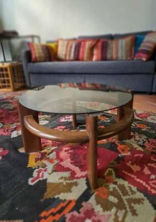 Tavolo rotondo da centro in legno di teak e piano in vetro fumé, Italia anni ‘60, Ø cm 68, h cm 35