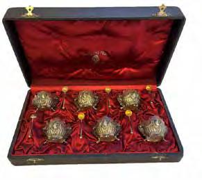 Serie di 6 saliere in argento in forma di cestine cesellate con motivi rocaille e vegetali complete di cucchiaini in argento e di vaschette sagomate in vetro in parte satinate, fine sec. XIX/inizio sec. XX, entro astuccio originale della Ditta Masetti Fedi