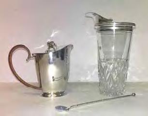 Caffettiera in metallo argentato in forma ovoidale, presa con fiore stilizzato, manico intrecciato in midollino e mixer per cocktail in cristallo e metallo argentato