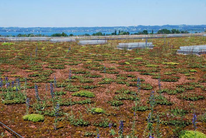 the ecological value of existing ones. This also includes targeted measures aimed at maintaining the diversity of species, such as designing roofs to be “insect-friendly” using various materials such as sand and gravel. In this case the subsurface is shaped such that it offers suitable nesting places for insects, as demonstrated on an area covering more than 7,300 m2 on the roof of Plant 6 in Gaißau.
