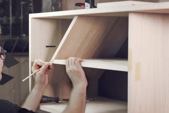 Recently, a Lamello Zeta P2 user asked for a quick and easy solution for inserting angled shelves into an entertainment unit after it had been lacquered. Traditionally, the process would have involved the gluing and lacquering of the complete unit but with multiple components and narrow angles incorporated into the design, it would have been a slow and laborious process.