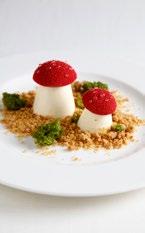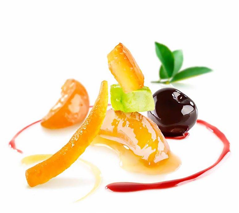 Mousse al Pecorino Romano Dop: montare 260 grammi di albumi con parte di sciroppo a 119°C. Unire 450 grammi di panna semi montata con la colla di pesce e il Pecorino Romano DOP macerato con zucchero, e parte di panna liquida.