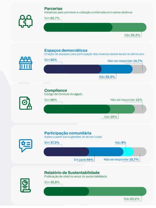 No Turismo, a governança representa o compromisso com a ética, a transparência e o diálogo. Monitorar essa dimensão é garantir que diversos atores, como a comunidade, os colaboradores, o poder público e os demais parceiros participem ativamente no futuro do empreendimento. O relatório aponta que no que diz respeito à ética e transparência, 68% dos empreendimentos possuem área de compliance ou código de conduta divulgado aos colaboradores. A criação de espaços democráticos para participação local foi promovida por 52% dos empreendimentos no último ano, no entanto, apenas 37,3% afirmam incorporar sugestões dos atores locais.