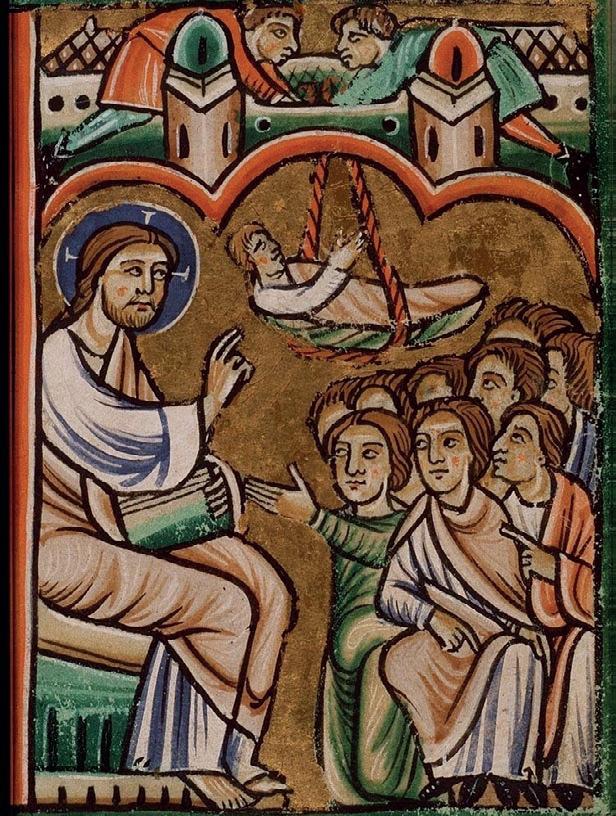Gesù guarisce il paralitico , Bibbia pittorica, Abbazia di San Bertino, Francia, ca. 1190-1200, Biblioteca Reale, L’Aia