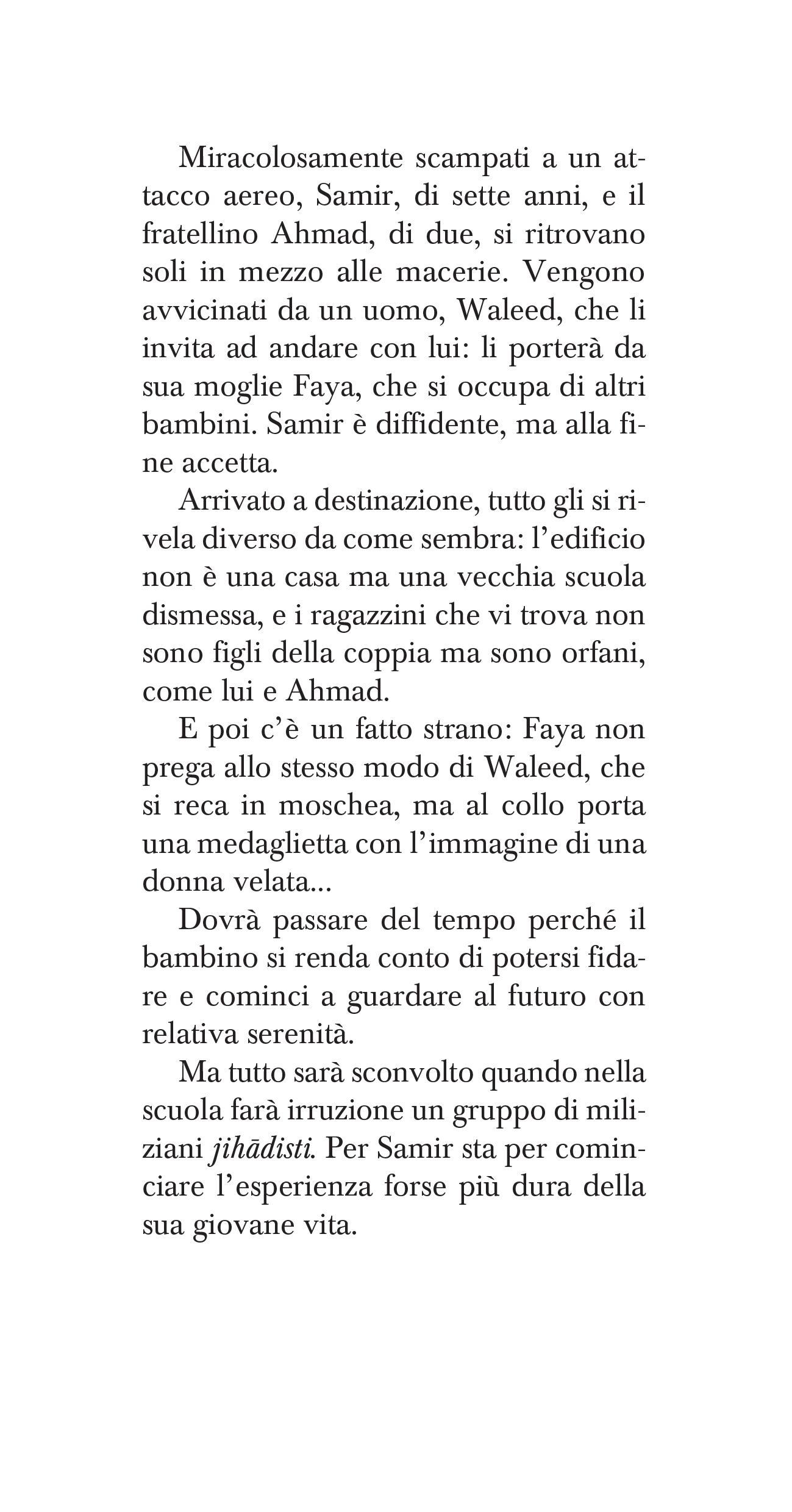 «Ma questa non è una casa» obietta Samir, irrigidendosi. Lui sa bene come è fatta una casa: quali sembianze ha, che odore emana. Una casa che si rispetti, tanto per cominciare, profuma di accoglienza. Certo, è da molto tempo che non ne vede una vera, dal momento che lui e Ahmad hanno trascorso l’ultimo anno rimbalzando tra la strada e quelli che gli adulti chiamano «orfanotrofi». Ma di una cosa è sicuro: quella non è una casa.