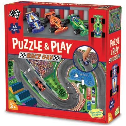 These play sets are double the fun! After assembling the 26” x 36” puzzles, use them as a playmat for the included wooden vehicles with working wheels.