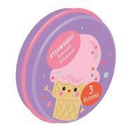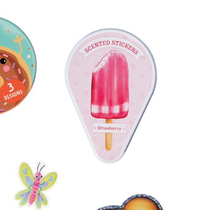 •30 tins with 10 of each scented sticker: vanilla, strawberry and chocolate