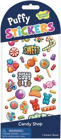 1 sheet permanent puffy stickers • 4”w x 9”h peggable pack • Minimum 12 per design