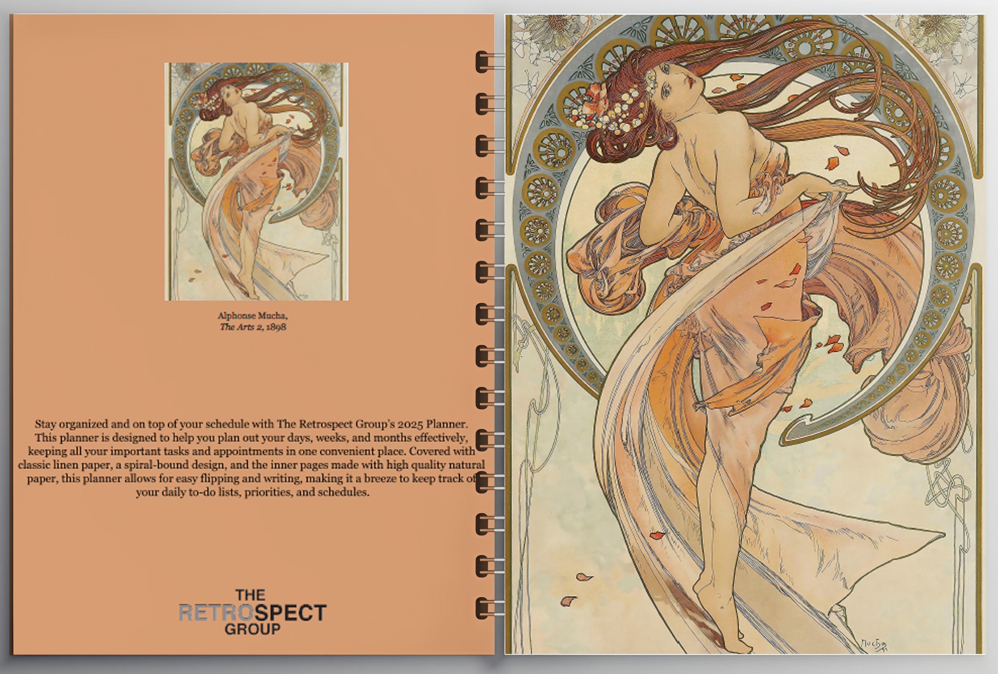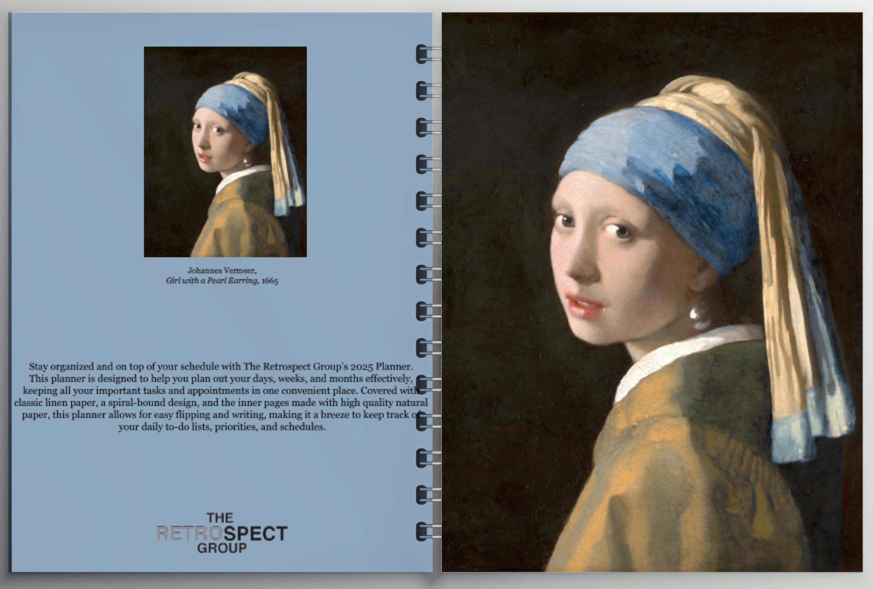 Our planners are made of classic linen and high quality natural paper in a spiral-bound design. The daily planner helps plan the day effectively and track your progress towards your goals. These planners, like all of our products are made in the USA. Covered with various famous artworks of your choosing on an 8.5" x 11" with the inner pages being 8.25" x 11". Each planner is individually packaged in a cello bag.