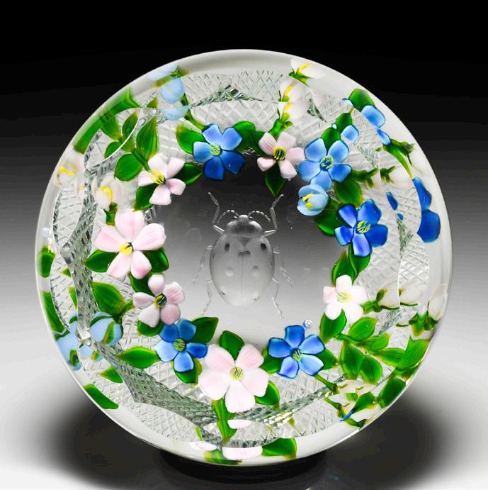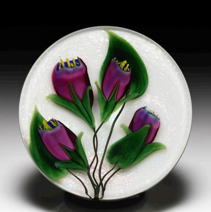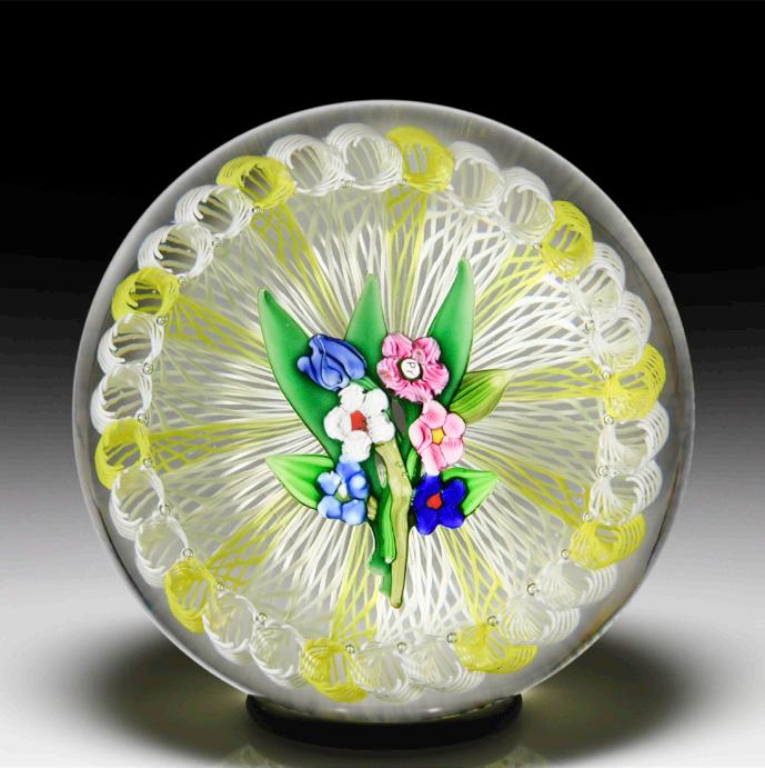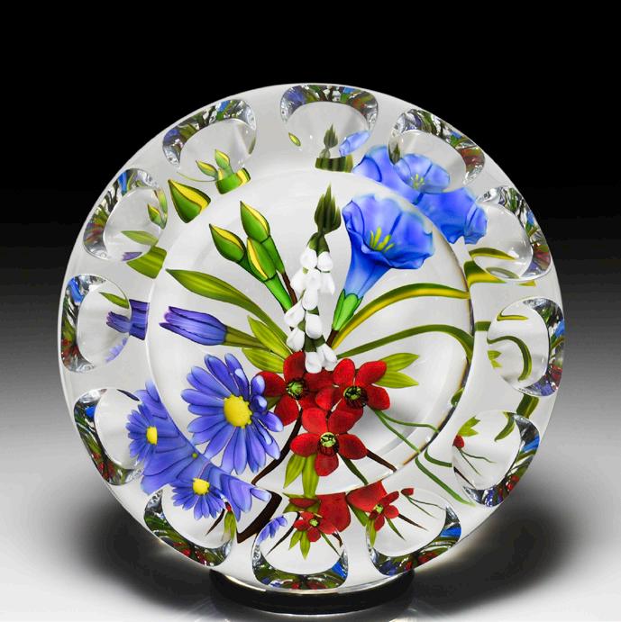 316 Perthshire Paperweights (2000) spring bouquet and torsade faceting paperweight. Two purple tulips, three small white flowers, a red and yellow flower with companion bud, two stems of ochre leaves and scattered dark green leaves are joined at the base and framed by a delicate pink, blue and white torsade. Diamond-cut clear ground, with mitre-cuts at the edge of the base. Three tiers of geometric facets and one top facet. Edition #9 of a limited edition of 30. Signed. Previously sold in the L.H. Selman Ltd. Fall 2012 52nd Auction as lot 324.